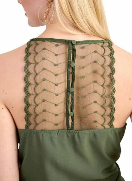 Top Naf Naf. Modèle en dentelle. Couleur verte. Décolleté en V. Avec des bretelles. Pièce en dentelle dans le dos avec fermeture boutonnée.