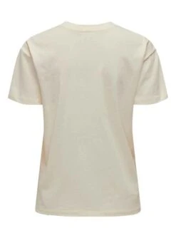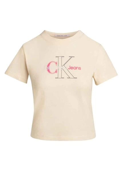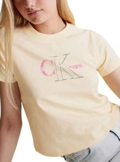 Chemise Calvin Klein. Modèle Bold Jumpsuitlogo. Couleur beige. Col rond. Manche court. Logo sur la poitrine. Le mannequin porte la taille S.