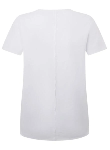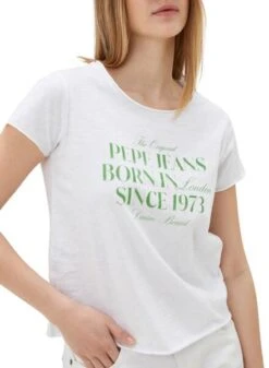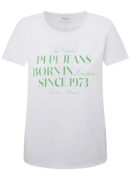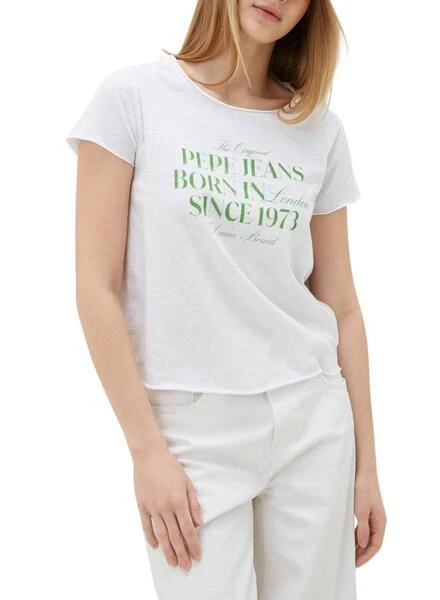 Chemise Pepe Jeans. Modèle Jasmine. Couleur blanche. Col rond. Manches courtes. Coupe régulière. Marque imprimée sur la poitrine. Détails en vert.