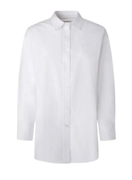 Chemise Pepe Jeans. Couleur blanche. Tissu popeline en coton. Coupe relaxed. Manches longues. Ourlet asymétrique. Logo brodé sur la poitrine. Empiècement arrière. Le modèle porte la taille S.