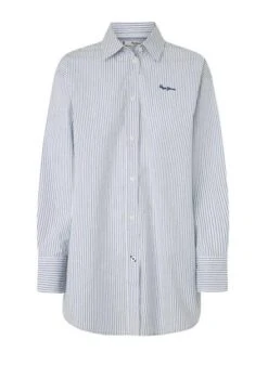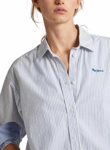Chemise Pepe Jeans. Tissu en popeline de coton. Coupe relax. Manches longues. Rayures imprimées. Ourlet asymétrique. Logo brodé sur la poitrine. Le mannequin porte la taille S.