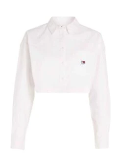 Chemise Tommy Jeans. Couleur blanc. Poche sur la poitrine. Écusson Tommy sur la poche. Format court. Manche longue. Épaules tombées. Le mannequin porte la taille S.
