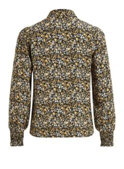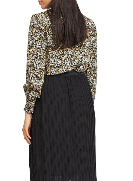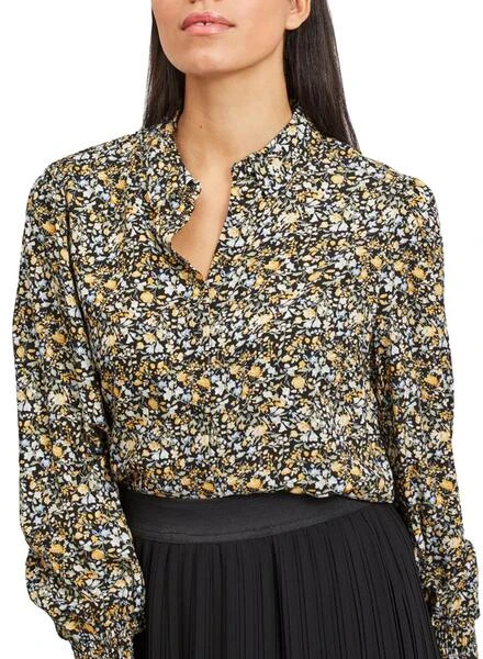Chemise Vila. Modèle Vitendi. Motif floral. Coloris noir, jaune et bleu clair. Fermeture boutonnée doublée. Manche longue. Poignets élastiqués. Élastique bas. Le mannequin porte une taille 38