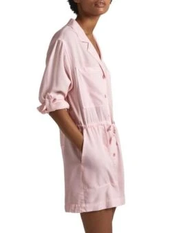 Combinaison courte Pepe Jeans. Modèle Elison. Couleur rose clair. Manches longues ajustables. Fermeture à boutons sur la poitrine. Poches poitrine. Taille ajustable avec cordons. Poignets boutonnés. Tissu en lyocell. Col en V avec revers. Le modèle porte la taille S.