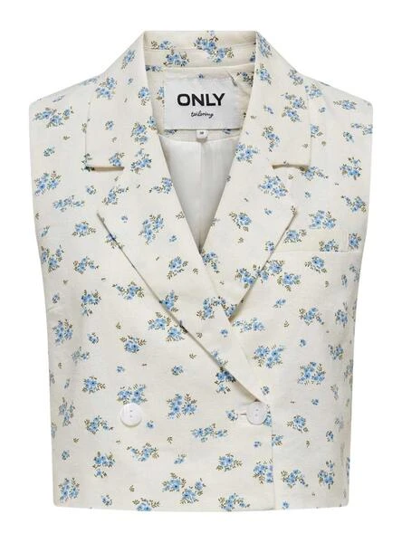 Top Only. Modèle cher. Couleur blanc. Printed mini fleur. Détails en bleu. Style gilet. Fermeture à double bouton. Revers de smoking. Sans manches. Regular fit Coupe courte.