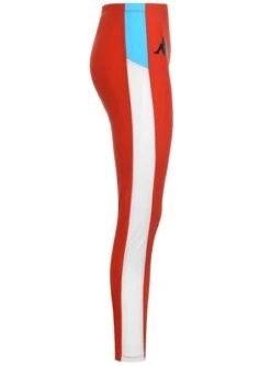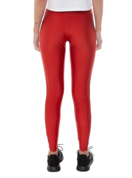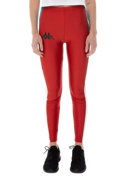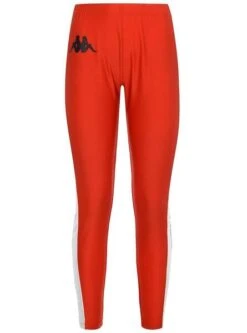 Legging Kappa. Modèle Carpin. Couleur rouge. Taille élastiquée. Logo noir imprimé. Bande latérale blanche et bleue. Coupe Skinny. Tissu élastique.