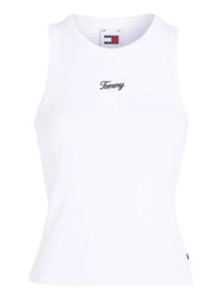 Maillot Tommy Jeans. Modèle Tank. Couleur blanche. Col rond. Logo brodé. Sans manches. Coupe ajustée.