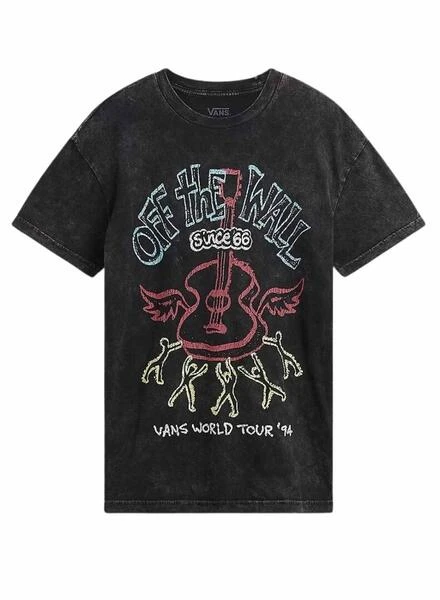 T-shirt Vans. Modèle Guitar Solo. Couleur noire. Effet usé. Coupe ample. Col rond. Manches courtes. Épaule tombante. Illustration imprimée sur le devant.
