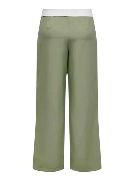 Pantalon Only. Modèle Diane Fold Down. Couleur vert. Détail blanc à la taille. Coupe fluide. Jambe large. Forme moderne. Fermeture avant. Taille haute.