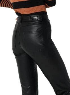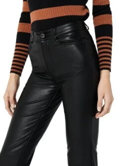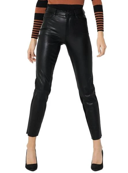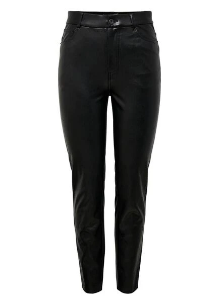 Pantalon Only. Modèle Emily. Tissu en similicuir noir. high rise. Bouton et fermeture éclair. Cinq poches. Coupez slim. Longueur de la cheville.