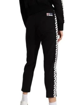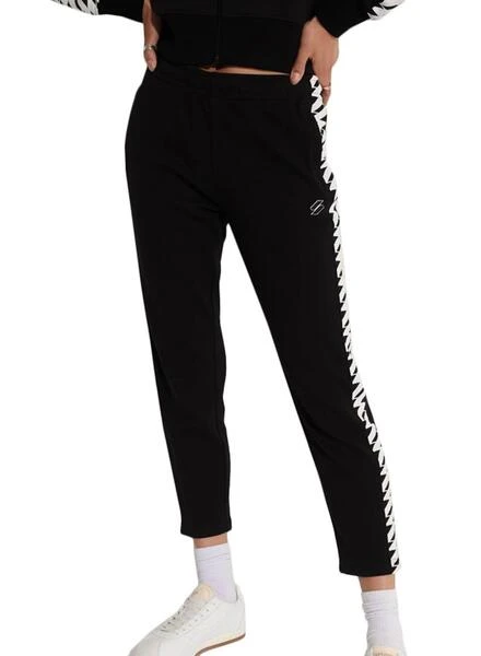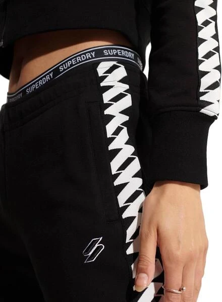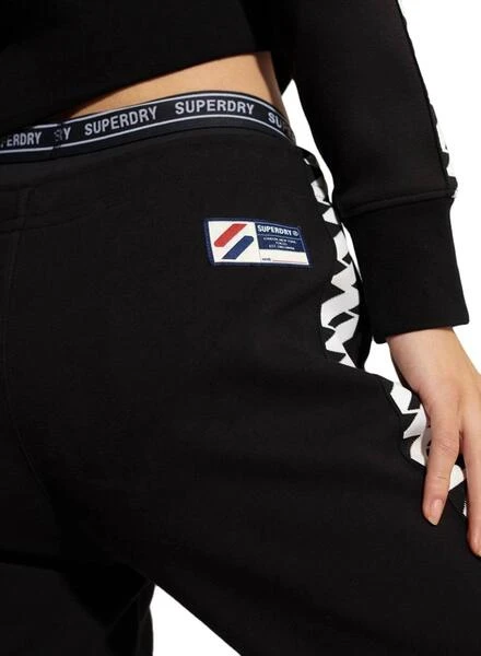 Pantalon de survêtement Superdry. Code modèle Tape. Couleur noire. Bande latérale de la taille à la cheville. Taille elastique. Logo sur le côté. Patch logo au dos. Le mannequin porte une taille S.