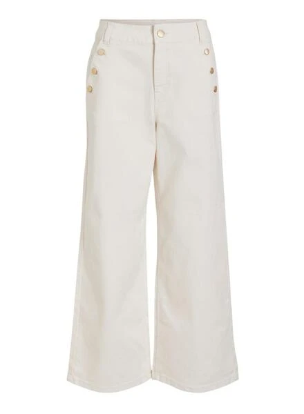 Pantalon Vila. Modèle Emma. Couleur blanche. 4 poches. Fermeture à bouton et à glissière. Boutons décoratifs sur les côtés. Avec passants. Taille haute.