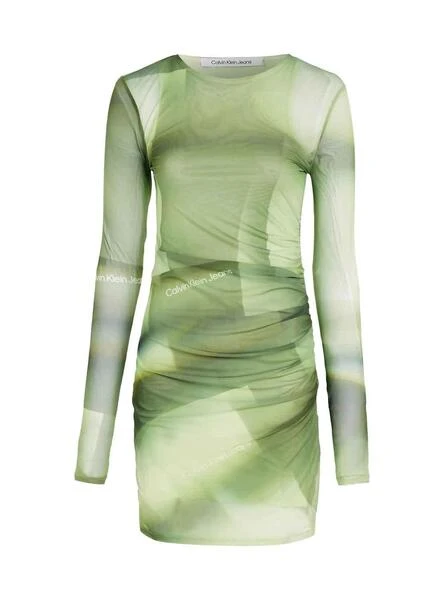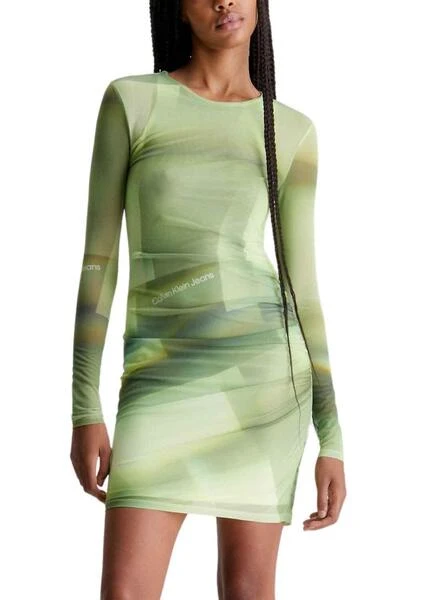 Robe Calvin Klein. Modèle lumineux. Couleur vert. Tissu en maille extensible. Convient au slim. Manche longue. Printed intégrale. Le mannequin porte la taille S.