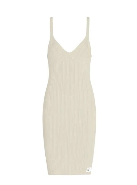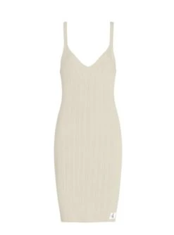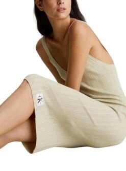 Robe Calvin Klein. Modèle Woven Label. Couleur verte. Sans manches. Bretelles élastiques. Encolure en V. Tissu en maille douce. Texture côtelée irrégulière. Coupe slim. Sans doublure ni fermetures. Logo en bas. Le mannequin porte la taille S.