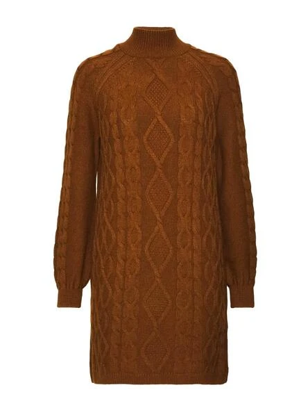 Robe Only. Modèle Freya. Couleur marron. Long cou. Extrémités nervurées. Tissu tricoté tressé. Bien au-dessus du genou. Regular fit