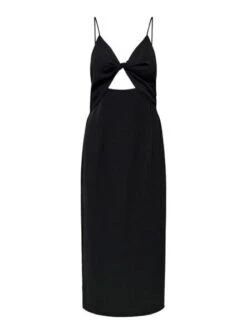Robe Only. Modèle Iris Thalia. Couleur noire. Coupe midi. Ouverture latérale. Fermeture à glissière arrière. Bretelles réglables. Encolure nouée. Découpe sous la poitrine.