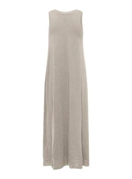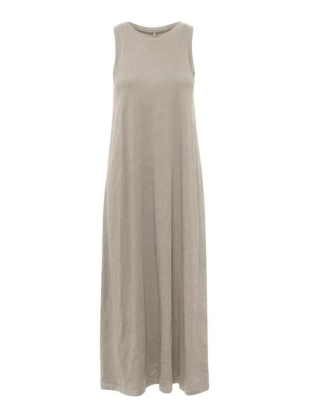 Robe Only. Modèle May. Couleur beige. Col rond. Sans manches. Coupe maxi. Tissu léger. Avec volume.