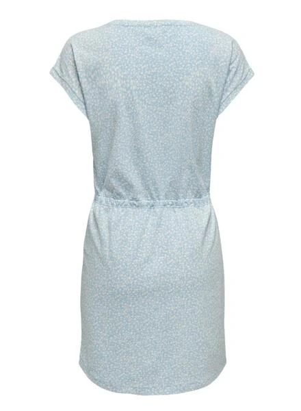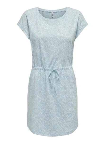 Robe Only. Modèle May. Couleur bleue. Manches courtes. Col rond. Imprimé intégral. Taille avec cordon. Coupe régulière.