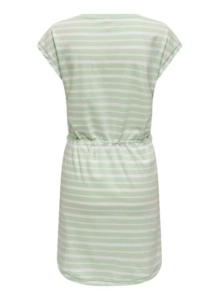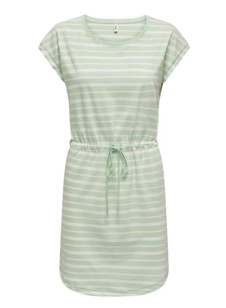 Robe Only. Modèle May. Couleur verte. Rayures imprimées. Col rond. Manches courtes. Taille ajustable avec cordon. Coupe régulière.