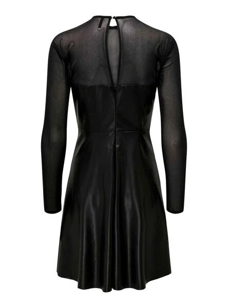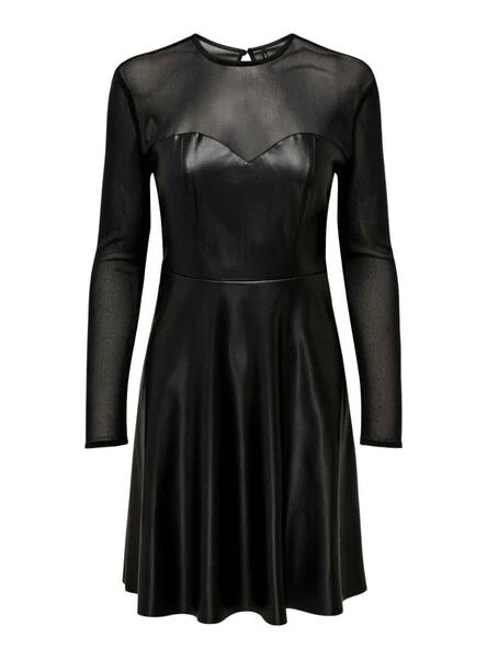 Robe Only. Modèle Megan. Couleur noir. Manche longue. Partie supérieur et manches en tulle noir transparent. Corps en similicuir. Décolleté en forme de coeur. Jupe avec vol.