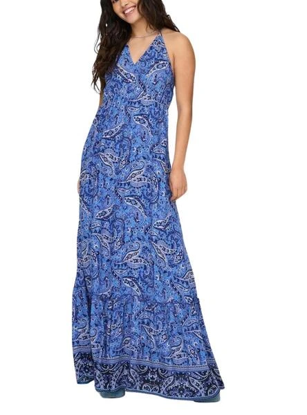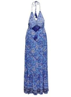 Robe Only. Modèle Veneda. Couleur bleue. Encolure prononcée. Fermeture au cou avec cordon et pompons. Décolleté dans le dos. Ourlet volanté. Tissu léger. Motif ethnique.