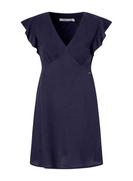 Robe Pepe Jeans. Modèle Camila. Couleur bleu marine. Col en V prononcé. Manches papillon avec volants. Plaque métallique avec logo de la marque. Fermeture éclair invisible sur le côté. Coupe mini.