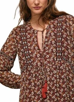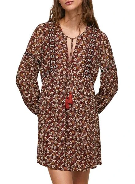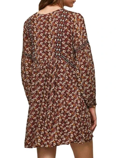 Robe Pepe Jeans. Coupe mini. Conception volante. Printed floral dans les tons marron. Modèle Liber. Détail brodé et perlé. manchette élastique et manche fluide.