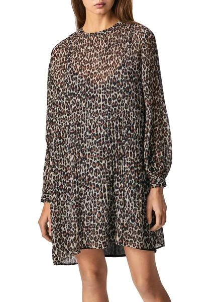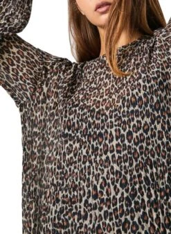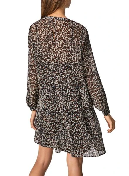 Robe Pepe Jeans. Modèle Nancy. Tissu semi-transparent imprimé animal. Conception plissé. Manche longue. Col haut. Ample. Fermeture au dos avec bouton.