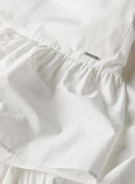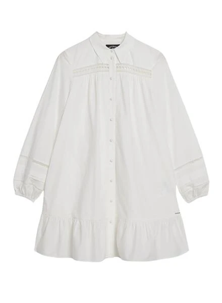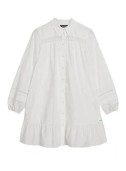 Robe Superdry. Modèle Lace Mix. Couleur blanche. Coupe décontractée (oversize). Manches longues. Col polo. Fermeture avec boutons sur le devant. Détails côtelés et à volants. Dentelle sur la poitrine et les manches. Manches larges. Le mannequin porte la taille S.