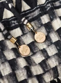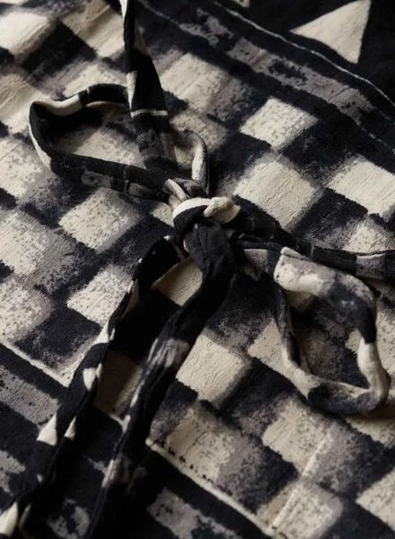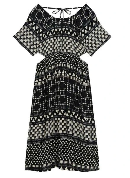 Robe Superdry. Modèle Shirbori. Couleur noire. Col rond. Manches courtes. Découpe sur les côtés. Longueur midi. Tissu léger. Imprimé géométrique. Encolure dans le dos. Cordon ajustable avec embouts métalliques.