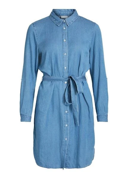 Robe Vila. Modèle Bista. Tissu jean. Couleur bleu. Ceinture. Poignets boutonnés. Fermeture boutonnée. Col de chemise. Effet délavé.