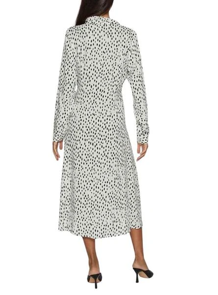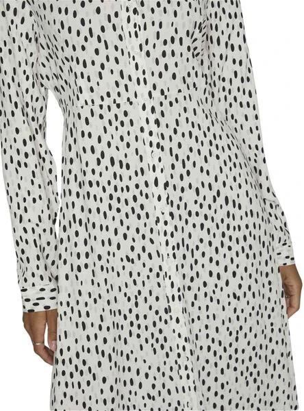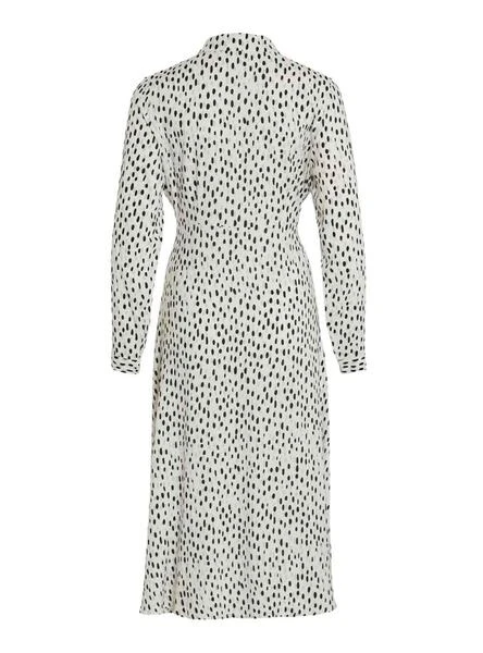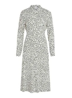 Robe Vila. Modèle Vipaya. Printed à pois. Couleur noir et blanc. Fermeture boutonnée. Col de chemise. Longueur midi. Style vestimentaire. Ceinture à nouer automatiquement.