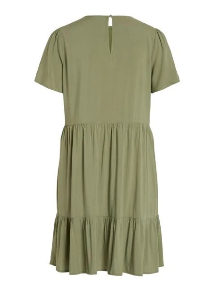 Robe Vila. Modèle Vipaya. Couleur verte. Col rond élastique. Manches courtes. Volants sur le bas. Tissu fluide. Fermeture avec bouton au cou. Le mannequin porte la taille S.