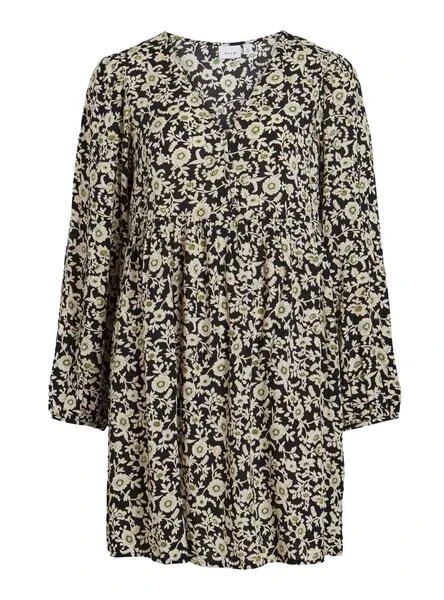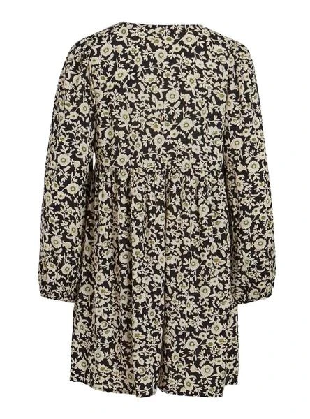 Robe Vila. Modèle VIPIL. Couleur noir. Printed de fleurs. Col en V. Manche long. Fermeture boutonnée. Découpe sur la poitrine. Monticules gonflés.