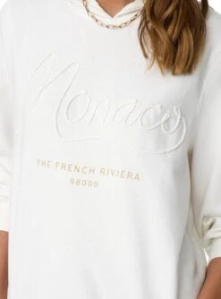 Sweat-shirt Only. Modèle Trust sailor Hood. Couleur blanche. Manches longues. Imprimé sur la poitrine. Avec capuche. Épaules tombantes. Poignets élastiques. Texte Sailing sur la poitrine. Le modèle porte la taille S.
