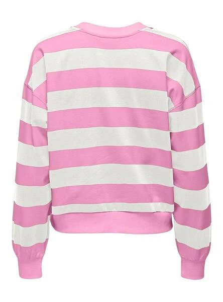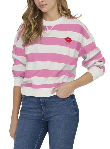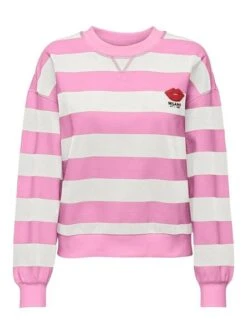 Sweat-shirt Only. Modèle Serena. Couleur rose. Manches longues. Col rond. Conception à rayures. Broderie sur la poitrine.