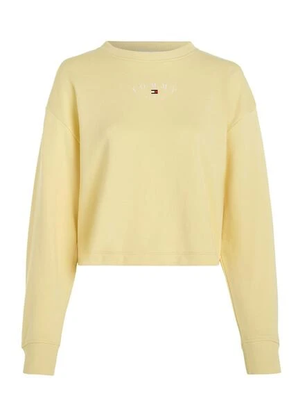 Tommy Jeans Sweatshirt. Modèle Essential Logo 2 Crew. Couleur jaune pastel. Col rond élastique. Logo sur la poitrine. Coupe courte. Le modèle porte la taille S.