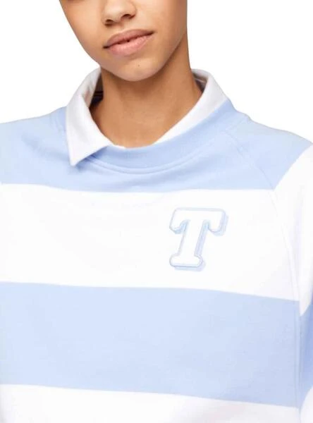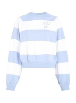 Sweat à capuche Tommy Jeans. Modèle Letterman. Couleur bleue. Manches longues. Col rond. Broderie sur la poitrine. Design à rayures. Coupe large.