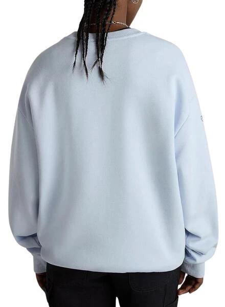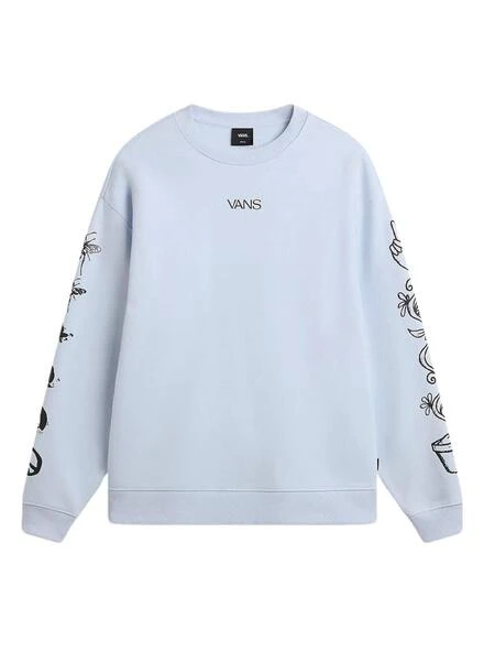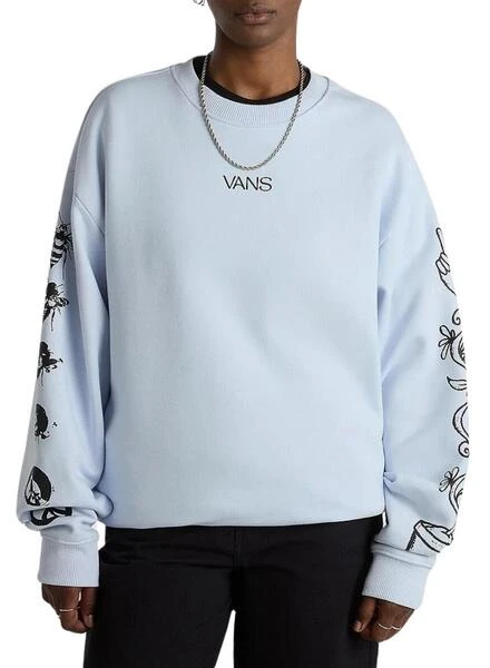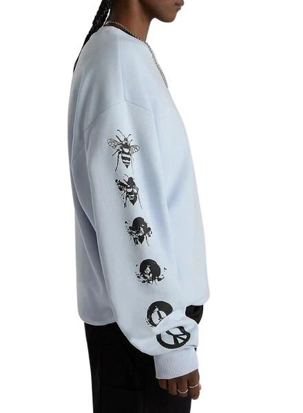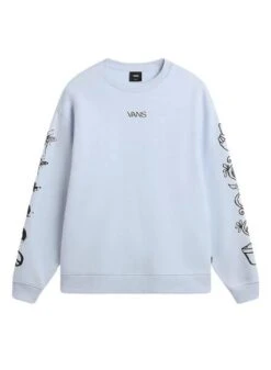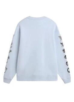 Sweat-shirt Vans. Modèle Peace. Couleur bleue. Col rond. Extrémités côtelées. Coupe ample. Logo imprimé sur la poitrine. Manches avec illustrations imprimées.