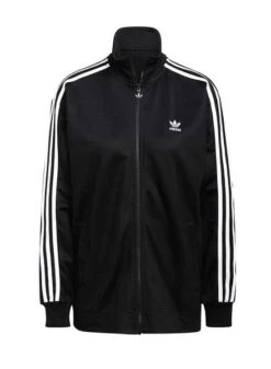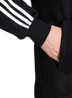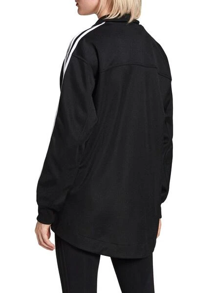 Adidas Sweat. Modèle de piste. Couleur noire. Long cou. Fermeture à glissière. Ample. Triple bande latérale blanche. Logo brodé sur la poitrine. Deux poches latérales.