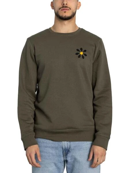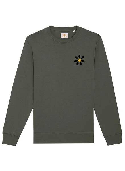 Sweat Klout. Modèle Rudbeckia. Couleur vert kaki. Col rond. Manche longue. Extrémités côtelées. Regular fit Fleur imprimée sur la poitrine. Illustration au verso.
