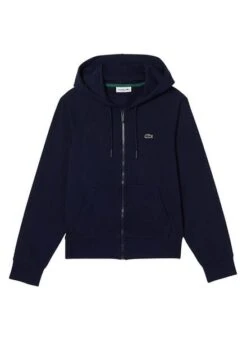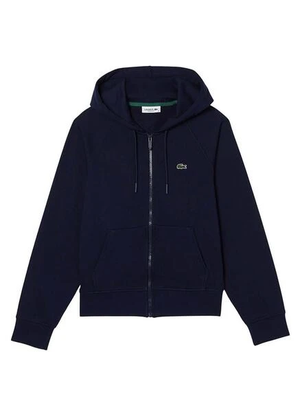 Sweat Lacoste. Modèle Basic. Couleur marine. Fermeture éclair. Capuche avec cordon réglable. Poches latérales. Logo brodé sur la poitrine. Extrémités élastiques. Regular fit