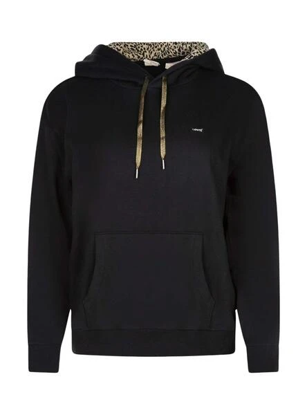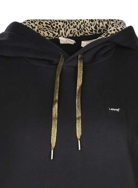 Sweat Lévis. Modèle Mosaic Animal. Couleur noir. Capuche réglable et intérieur en tissu léopard. Cordun des capots dorés. Coupe droite. Patch de la marque brodé sur la poitrine. Kangourou Poche sur le devant.