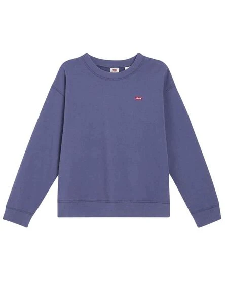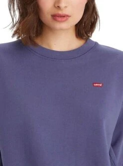 Sweat Levis. Modèle standard. Couleur violet. Col rond élastique. Ajustement normal. Manche longue. Extrémités élastiques. Épaules tombées. Levis Logo sur la poitrine. Le mannequin porte la taille M.