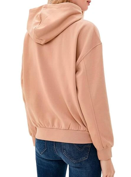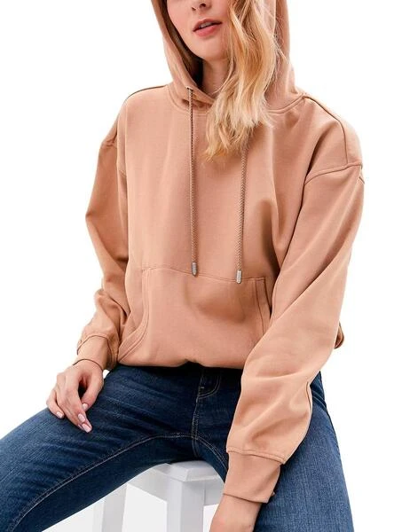 Sweat Only. Modèle Abra. Couleur beige Capuche réglable Coupe baggy. Coutures décoratives. Poche kangourou Extrémités côtelées Le mannequin porte une taille S.