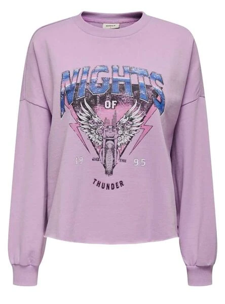 Sweat Only. Modèle Lucinda. Couleur violet. Col rond élastique. Manche longue. Épaules tombées. Printed « Nuits » sur la poitrine. Poignets élastiques. Col rond.