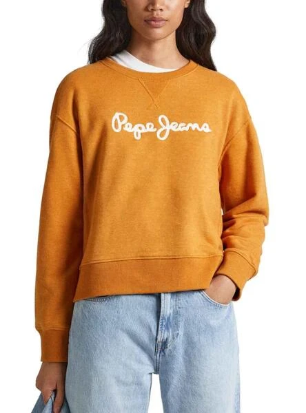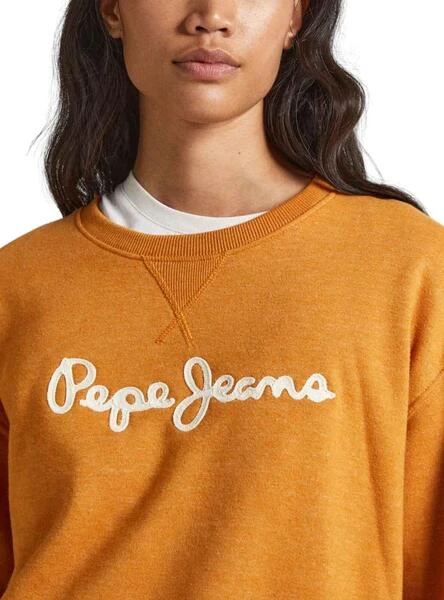 Sweat Pepe Jeans. Modèle Nanette. Couleur jaune. Extrémités élastiques. Manche longue. Logo imprimé sur la poitrine. Regular fit Détail triangulaire sur le cou.