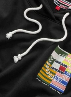 Sweat Tommy Jeans. Modèle de luxe Relaxed. Couleur noir. Avec capuche ajustable. Manche longue. Style kangourou Poches. Epaules tombantes. Poignets et ourlet élastiques. Badge Logo sur la poitrine. Printed au dos.