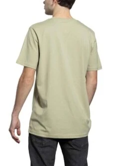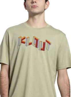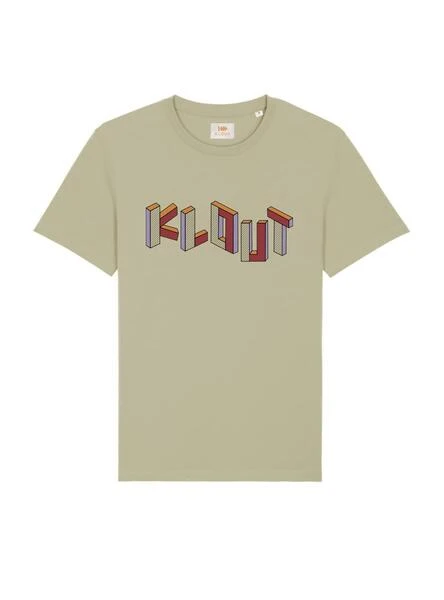 T-Shirt Klout. Modèle Art. Couleur vert. pour femme et homme. Coupe régulière. Col rond côtelé. Manche court. Graphique sur la poitrine. 180GSM. Fabriqué en coton biologique. Étiquettes : GOTS, OEKO TEX, PETA, FAIR WEAR LEADER. Disponible en gris.