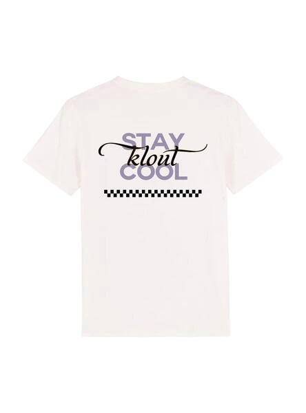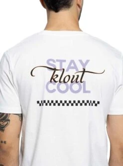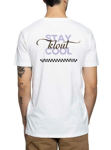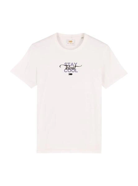T-Shirt Klout pour homme et femme. Modèle Cool. Couleur blanc. Col rond. Manche court. Graphique sur la poitrine et dans le dos. Col côtelé. Laver à 30º. Coupe régulière. Étiquettes : GOTS, OEKO TEX, PETA, FAIR WEAR LEADER. Disponible en noir.